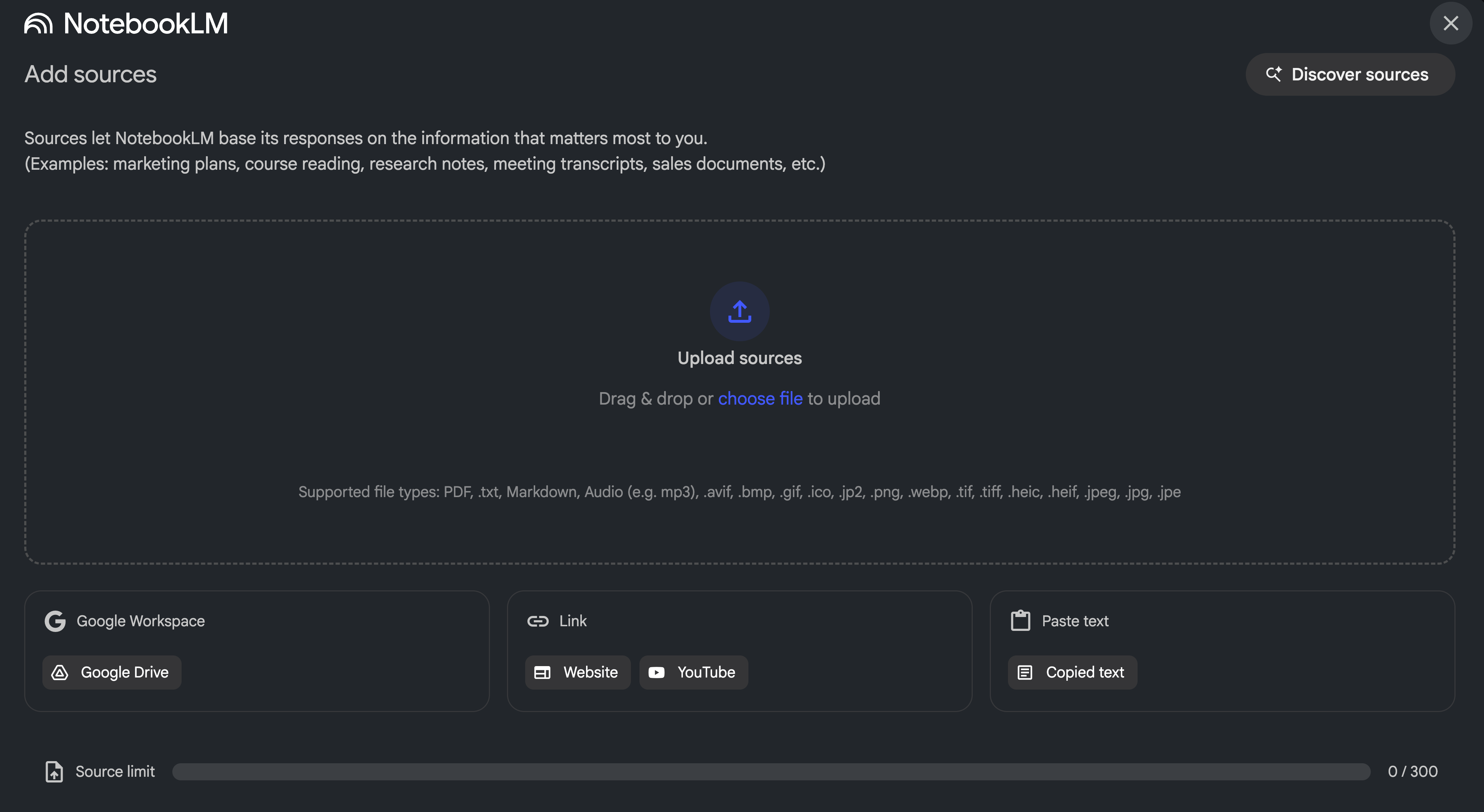 Available on: Free with personal Google accounts or Google Workspace accounts. Workspace users get access to higher source limits (up to 300 sources per notebook) and team collaboration features.