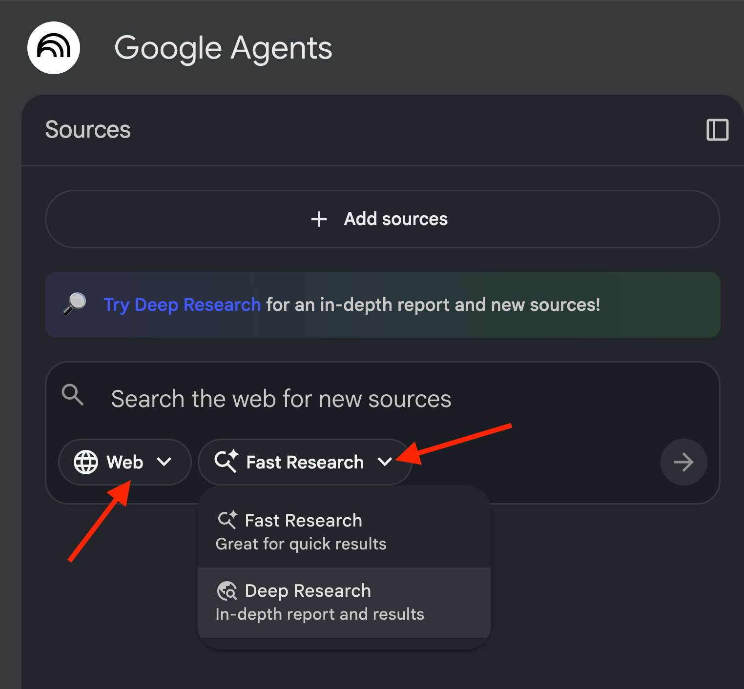 The game-changer here is Deep Research. You describe what you’re looking for, and NotebookLM acts like a dedicated researcher who: