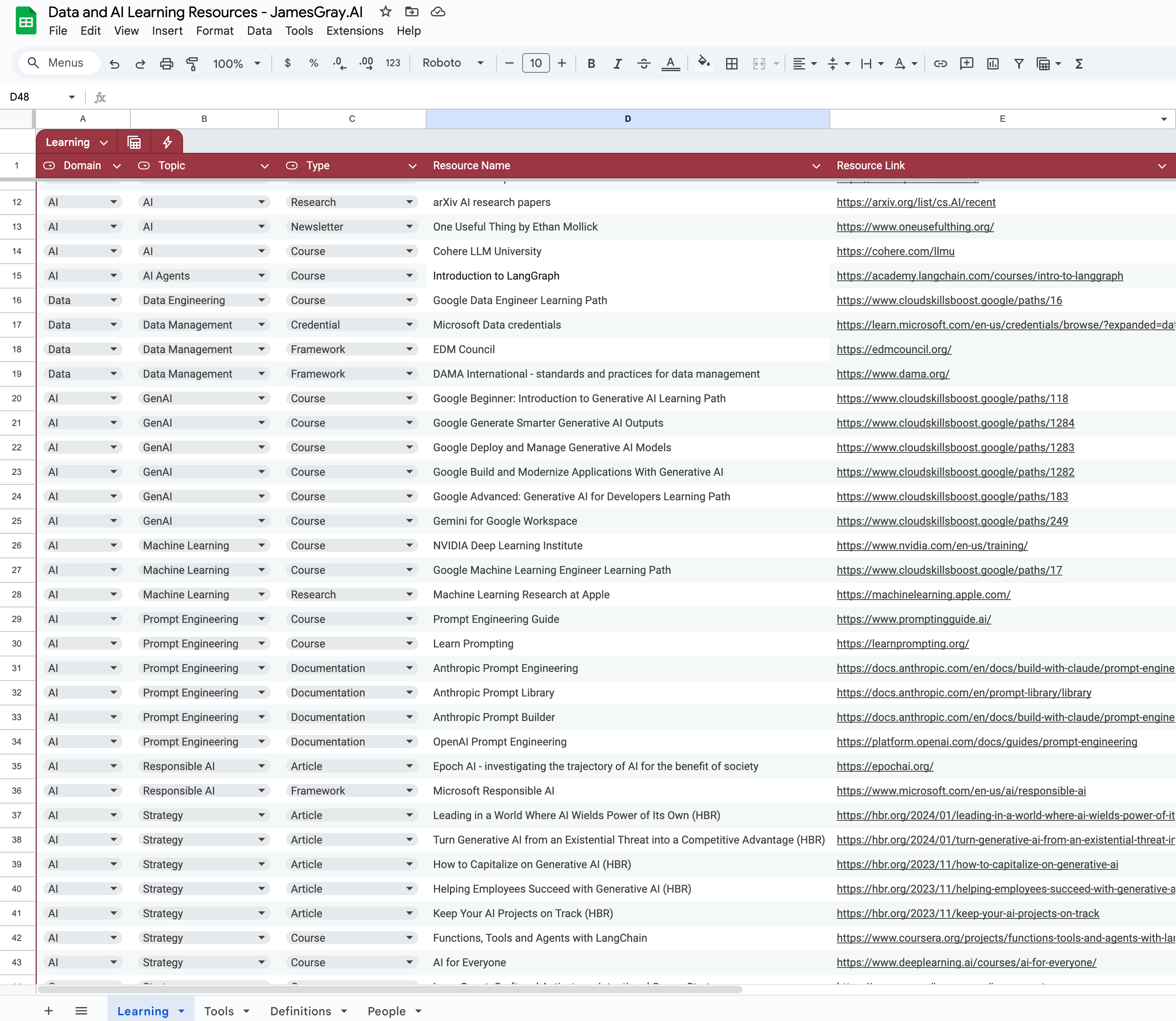 Data and AI Learning and Tools Google Sheet