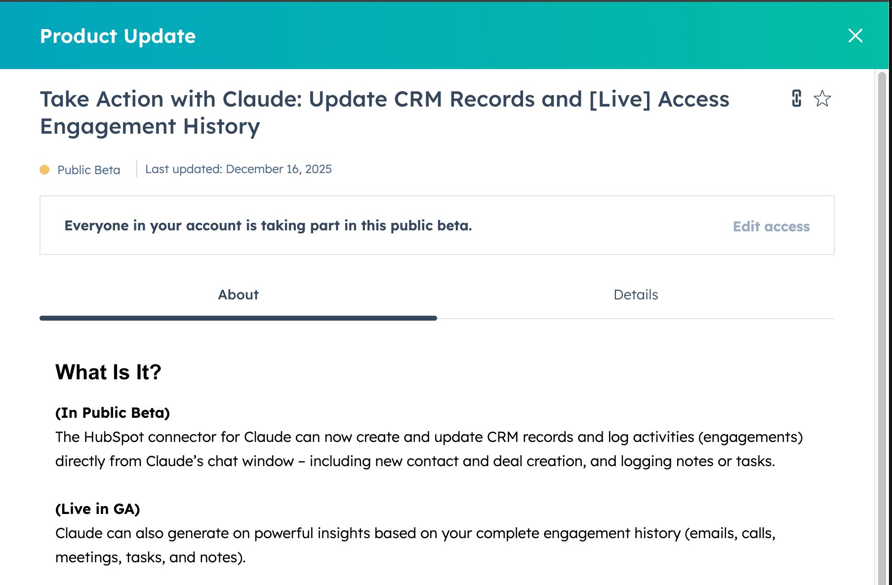 Here’s what changed: HubSpot’s Claude connector can now write to your CRM. That means Claude can create contacts, update deal stages, log notes, and create tasks—directly from the chat window.