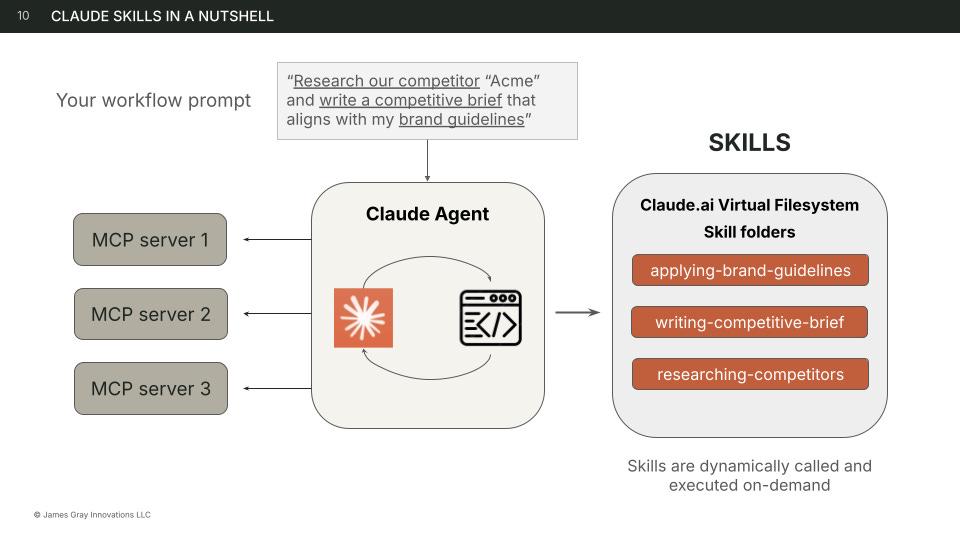 The mental model: Think of Skills as instruction manuals. When you ask Claude to “organize meeting notes,” it automatically reads the how-to manual you’ve created, complete with edge cases, examples, and resources.