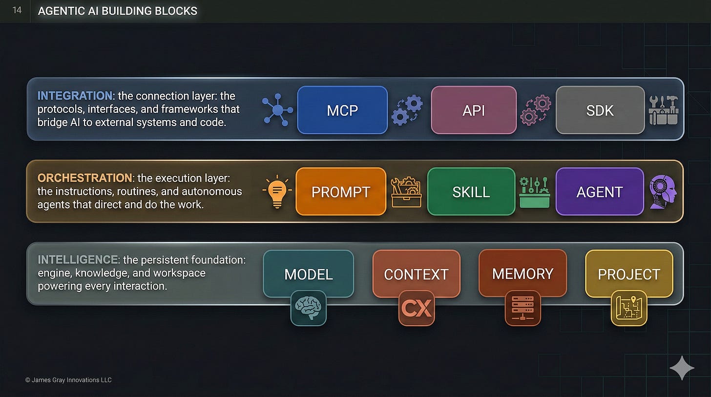 The first seven blocks can all live inside a chat window. These last three are how AI breaks out of that window and operates inside your actual business systems. For many leaders, this is where the ROI conversation gets real.